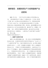 调研报告:发展新质生产力培育富硒产业的思考2023年以来,习近平总书记从概念认识到实践方法论,就发展新质生产力做出了全面的论述。今年的《政府工作报告》当中提出加快发展新质生产力,要积极培育新兴产业和未来产业。其中就包括加快前沿新兴产业发展,积极打造生物制造新增长引擎。简单说,就是颠覆性技术和前沿技术在各行各业的创新应用,催生新产业、新模式、新动能,给大家带来幸福感和获得感。盘点我市农业资源,面对我市农业发展现状,以新质生产力提升硒产业前景广阔,带动力强。现就有关情况报告如下:一、富硒产业相关内涵硒是人体必需的微量元素,是人类迄今发现的最重要的抗衰老元素,在国际医药界和营养学界被誉为“生命之火”...