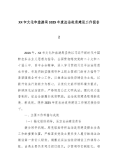 XX县文化旅游体育局2025年度法治政府建设工作报告1 2025年以来,在县委、县政府的坚强领导和科学指导下,XX县文化旅游体育局坚持以习近平新时代中国特色社会主义思想为根本遵循,全面贯彻党的二十大、二十届三中、四中全会精神,深入践行习近平法治思想,紧紧围绕“法治中国”“法治政府”“法治社会”一体建设战略部署,严格落实中央《法治中国建设规划(2020—2025年)》《法治政府建设实施纲要(2021—2025年)》及《法治社会建设实施纲要(2020—2025年)》(以下简称“一规划两纲要”)要求,以《XX县提升行政执法质量三年行动计划(2023—2025年)实施方案》为行动指南,将法治建设深度...
