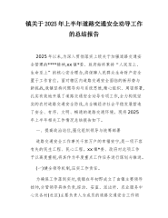 镇关于2025年上半年道路交通安全劝导工作的总结报告2025年以来,为深入贯彻落实上级关于加强道路交通安全管理的****精神,xx镇*委、政府始终秉持“人民至上、生命至上”的核心安全理念,将保障人民群众生命财产安全置于工作首位。面对辖区内道路交通安全面临的新形势与新挑战,我镇坚持问题导向与系统思维,精心组织、周密部署,扎实有效地开展了道路交通安全劝导专项工作,全力构筑坚实的农村道路交通安全防线,为全镇经济社会平稳发展营造了安全、有序、文明、畅通的道路交通环境。现将2025年上半年相关工作情况总结报告如下。一、提高政治站位,强化组织领导与统筹部署道路交通安全工作事关千家万户的幸福安宁,是一项不容...