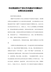 市纪委监委关于深化作风建设专项整治行动情况的总结报告市委并报省纪委监委:根据中央及省委关于持之以恒落实中央深化作风建设、持续整治群众身边腐败和不正之风的系列决策部署,市纪委监委在全市范围内组织开展了为期*个月的深化作风建设专项整治行动。此次行动旨在坚决纠治形式主义、官僚主义、享乐主义和奢靡之风等顽瘴痼疾,特别是聚群众反映强烈、影响高质量发展、损害党和政府形象的突出问题,以铁的纪律和实的举措推动全市作风建设向纵深发展,营造风清气正、干事创业的政治生态。目前,集中整治阶段已告一段落,现将有关情况总结报告如下。一、提高政治站位,周密组织实施,确保专项整治有力有序推进市委和市纪委监委深刻认识到,作风建...