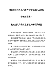 代表在全市人民代表大会审议政府工作报告的发言素材构建现代产业体系厚植实体经济优势 要围绕智慧城市、智能制造等领域,拓展“5G+工业互联网”典型应用场景,助力企业智造更多工业互联优势产品。 要持续打通“两链”融合转化通道、“两业”融合发展路径,做强汽车零部件等优势制造业,以“强二优三”激活现代化产业体系。 要大力推进5G全连接工厂建设,推动我市创建全国首批“5G+工业互联网”融合应用先导区。 要加快以种业为重点的农业科技创新,建设乡村电商直播中心,打造农村电商品牌,提升农产品附加值,推动农民增收致富。 要谋划新一轮制造业高质量发展政策,鼓励企业建设数字化流水线、车间、工厂,引导技工学校...