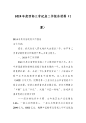 2024年度西部五省政府工作报告材料(5篇)2024年贵州省政府工作报告各位代表: 现在,我代表省人民政府向大会报告工作,请予审议并请省政协委员和其他列席人员提出意见。 一、2023年工作回顾 2023年是全面贯彻党的二十大精神的开局之年,是三年新冠疫情防控转段后经济恢复发展的一年,也是本届政府履职的第一年。全省上下认真贯彻党的二十大精神和习近平总书记视察贵州重要讲话精神,深入落实国发〔2022〕2号文件,按照省委十三届历次全会和省委经济工作会议部署,坚持以高质量发展统揽全局,坚定不移围绕“四新”主攻“四化”、建设“四区一高地”,推动高质量发展迈出坚实步伐! ——经济持续回升向好。全年...