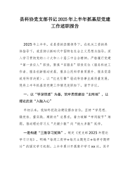 县科协党支部书记2025年上半年抓基层党建工作述职报告2025年上半年,在县委的坚强领导下,在机关工委的具体指导下,我坚持以新时代中国特色社会主义思想为指导,深入学习贯彻党的二十大和二十届三中全会精神,严格履行党建“第一责任人”职责,聚焦“四服务”职责定位(服务科技工作者、服务创新驱动发展、服务公民科学素质提升、服务党委政府科学决策),以“红色引擎”驱动科协事业高质量发展。现将上半年抓基层党建工作情况述职如下,请予评议。一、以“学深悟透”为基,筑牢思想建设“主阵地”,让理论武装“入脑入心”年初以来,我始终把政治建设摆在首位,坚持“学思想、强党性、重实践、建新功”总要求,着力破解“学用脱节”难题...