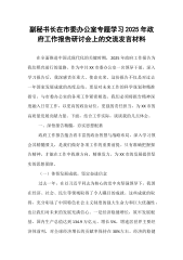 副检察长在检察院党组理论学习中心组专题学习2025年政府工作报告交流会上的研讨发言2025年政府工作报告高屋建瓴、内涵丰富,为我们指明了前行方向,提供了行动指南。作为XX市人民检察院的一员,我深感责任重大、使命光荣。这份报告不仅是对过去一年工作的全面总结,更是对未来发展的科学谋划,与检察工作息息相关。通过深入学习,我深刻认识到,我们必须将报告精神融入到检察工作的方方面面,以更高的政治站位、更强的责任担当,为推动XX经济社会高质量发展贡献检察力量。下面,结合我院工作实际,谈谈我的几点体会。一、深研报告要义,筑牢思想根基政府工作报告是国家发展的风向标,蕴含着丰富的思想内涵和政策导向。深入学习报告,...
