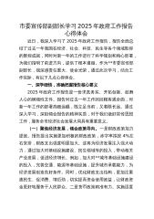 宣传思想文化系统领导干部学习2025年政府工作报告心得体会在认真研读2025年政府工作报告后,我深受鼓舞,也深感责任重大。这份报告不仅全面总结了过去一年的工作成就,更为未来的发展指明了方向。作为XX宣传思想文化系统的一名党员领导干部,我将紧密结合宣传思想工作实际,深入学习领会报告精神,切实把思想和行动统一到党中央的决策部署上来。一、深刻领会,精准把握报告精髓要义政府工作报告是我们党和国家在新时代推进各项事业发展的重要指南,其内容涵盖广泛,思想深邃。作为宣传思想工作者,我们要先学一步、深学一层,准确把握报告的核心要义、精神实质和丰富内涵,为后续的宣传贯彻工作奠定坚实基础。(一)聚焦发展成就,增强...