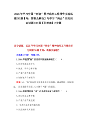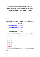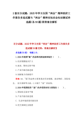 2025年全国两会应知应会测试题【100分试题】与学习全国“两会”精神政府工作报告多选试题50题【附:答案及解析】2份题2025年全国两会应知应会测试题【100分试题】附全部答案一、单项选择题(每题1分,共80分)二、多项选择题(每题2分,共20分)一、单项选择题(每题1分,共80分)1.2024年我国国内生产总值达到134.9万亿元,增速为(),对全球经济增长的贡献率保持在()左右。A.4.5%:25%B.5%;30%C.5.5%;35%D.6%:40%答案解析:B。2.2024年我国城镇新增就业人数为(),城镇调查失业率平均为()。A.1200万人;5%B.1256万人;5.1%C.130...