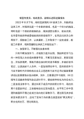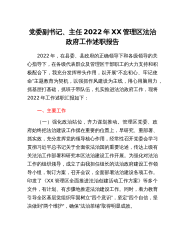 党委副书记、主任2022年XX管理区法治政府工作述职报告2022年,在县委、县政府的正确领导下和各级领导的关心指导下,在各级代表群众及管理区干部职工的大力支持和积极配合下,我充分发挥带头作用,以开展“不忘初心、牢记使命”主题教育为契机,以强抓作风建设为主线,用心用脑用力,抓基层打基础,抓班子带队伍,扎实推进法治政府工作,现将2022年工作述职汇报如下:一、主要工作(一)强化政治站位,齐力谋划推动。管理区党委、政府始终把法治建设工作摆在重要的位置上,早研究、重部署、抓实效,充分发挥党的领导核心作用,经常性召开党委会学习贯彻习近平总书记关于全面依法治国的重要论述,传达上级有关法治工作部署和研究本区...