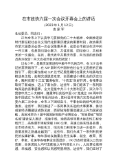 在市政协六届一次会议开幕会上的讲话(2023年1月12日)袁家军各位委员、同志们:正当全市上下认真学习贯彻党的二十大精神,全面推进新时代新征程社会主义现代化新重庆建设的重要时刻,政协重庆市第六届委员会第一次会议隆重开幕,这是全市政治生活中的一件大事,也是我们凝心聚力、共谋发展、团结奋斗、共创未来的一次盛会。在此,我代表中共重庆市委,向当选的政协委员表示祝贺!向大会召开表示热烈祝贺!过去5年,是重庆发展进程中极不平凡的五年。在XJP总书记的英明领导下,在XJP新时代中国特色社会主义思想的正确指引下,我们紧扣推动XJP总书记殷殷嘱托在重庆大地落地生根这条主线,如期完成脱贫攻坚、全面建成小康社会的历...