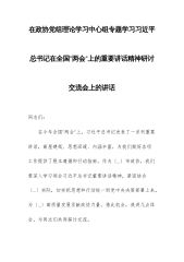 在理论学习中心组专题学习习近平总书记在全国“两会”上的重要讲话精神研讨会上的讲话(1)同志们:在全国“两会”胜利召开之际,习近平总书记亲临江苏代表团,对江苏工作提出“经济大省要挑大梁,为全国发展大局作贡献”的明确要求,这是对江苏发展的高度重视和殷切期望,为我们做好各项工作指明了方向、提供了根本遵循。作为x市人大,我们要深刻领会习近平总书记重要讲话精神,切实把思想和行动统一到党中央决策部署上来,以更高的政治站位、更强的责任担当,为x高质量发展贡献人大力量。下面,围绕本次专题学习,我谈几点体会,与同志们共同交流。一、深刻领会习近平总书记重要讲话精神,提升思想认识习近平总书记的重要讲话,高屋建瓴、思...