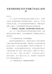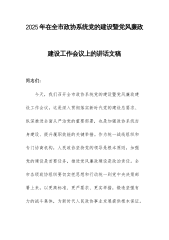 2025年在全市政协系统党的建设暨党风廉政建设工作会议上的讲话文稿同志们:今天,我们召开全市政协系统党的建设暨党风廉政建设工作会议,这是深入贯彻落实新时代党的建设总要求、纵深推进全面从严治党的重要部署,也是加强政协系统自身建设、提升履职效能的关键举措。作为统一战线组织和专门协商机构,人民政协坚持党的领导是根本原则,加强党的建设是首要任务,推进党风廉政建设是政治责任。全市各级政协组织要切实把思想和行动统一到党中央决策部署上来,以更高标准、更严要求、更实举措,锻造坚强有力的战斗集体,为新时代人民政协事业发展提供根本保证。一、坚持政治引领,深化理论武装,筑牢政协党建的思想根基党的政治建设是党的根本性...