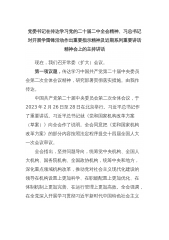 党委书记在传达学习党的二十届二中全会精神、习总书记对开展学雷锋活动作出重要指示精神及近期系列重要讲话精神会上的主持讲话现在,我们召开常委(扩大)会议。第一项议题,传达学习中国共产党第二十届中央委员会第二次全体会议精神,研究部署贯彻落实措施。由我作传达。中国共产党第二十届中央委员会第二次全体会议,于2023年2月26日至28日在北京举行。习近平总书记作了重要讲话。习近平总书记就《党和国家机构改革方案(草案)》向全会作了说明。全会同意把《党和国家机构改革方案》的部分内容按照法定程序提交十四届全国人大一次会议审议。全会指出,坚持问题导向,统筹党中央机构、全国人大机构、国务院机构、全国政协机构,统筹中...