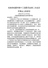 在政协临夏州第十三届委员会第二次会议开幕会上的讲话(2022年12月9日)甘肃省临夏回族自治州州委书记 各位委员,同志们:正值全州上下深入学习贯彻党的二十大精神之际,政协临夏州第十三届委员会第二次会议隆重开幕了,这是全州人民政治生活中的一件大事,对于广泛凝聚各方共识、充分激发团结奋斗合力具有十分重要的意义。在此,我代表中共临夏州委,向会议的召开表示热烈的祝贺!向各位委员和与会同志致以诚挚的问候!2022年,是党和国家历史上具有里程碑意义的一年,举国关注、举世瞩目的党的二十大胜利召开,描绘了全面建设社会主义现代化国家、全面推进中华民族伟大复兴的宏伟蓝图,为我们做好工作指明了前进方向、提供了根本...