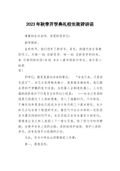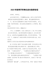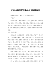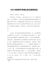 2023年秋季开学典礼校长致辞讲话各位老师,孩子们,大家好!三年疫情打破了我们平静的生活,三年疫情让我们的学习变得杂乱无章,网课的日子是一地鸡毛的过往。网课让母子失和,网课让师生不爽,三年疫情让我们失去了太多太多的欢乐、友谊和大好的学习时光。有人说网课是“照妖镜”,让真假美猴王得以现身,真心爱学习还是假意在应付,一览无余!通过开学后的网课教学效果检测,更是印证了这一传闻。孩子们!今天我不准备给大家讲大道理,只想给大家举一些生活实例,请大家配合我回答问题。一棵小树生长一年可以做啥?……(只能烧火做饭当柴用)一棵小树生长十年可以做啥?……(可以当檩条,锹把等)一棵小树生长二十年可以做啥?……(可以...
