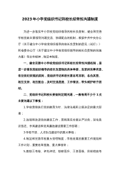 2023年小学党组织书记和校长经常性沟通制度与在推进建立中小学校党组织领导的校长负责制会上的表态发言(2篇文)供参考2023年小学党组织书记和校长经常性沟通制度为进一步落实中小学校党组织领导的校长负责制,健全和完善学校党政主要领导沟通交流、协调配合的机制,根据中共中央办公厅《关于建立中小学校党组织领导的校长负责制的意见(试行)》和省委办公厅《关于建立中小学校党组织领导的校长负责制的实施方案》等文件精神,制定本制度。一、健全完善中小学校党组织书记和校长经常性沟通机制,是进一步落实党组织领导的校长负责制的具体举措,应坚持实事求是、依法依纪依规的原则,党组织书记和校长要各司其职、各负其责、相互支持、...