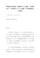 明确机制落实责任全面推动“云上监督”工作质效齐升——在武进区人大“云上监督”工作机制座谈会上的讲话(二〇二六年一月二十八日)武进区人大常委会主任同志们: 日月其迈,时盛岁新。今天,我们召开武进区人大“云上监督”工作机制座谈会,目的是深入落实习近平总书记关于坚持和完善人民代表大会制度的重要思想,全面贯彻区委对“十五五”发展战略的部署要求,进一步明晰“云上监督”工作机制流程,压实责任分工,着力推动“云上监督”工作质效齐升。 区人大常委会坚持目标导向,在本月初以一周时间高效完成“云上监督”功能改版升级,监督方向更清晰、覆盖范围更全面、应用功能更实在。同时,区人大常委会以2026年“一号文件”形式...
