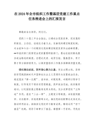 在2024年全市组织工作暨基层党建工作重点任务推进会上的汇报发言尊敬的各位领导,同志们。党的二十届三中全会指出,以调动全党抓改革、促发展的积极性、主动性、创造性为着力点,完善党的建设制度机制,对当前和今后一个时期深化党的建设制度改革作出战略部署。**市组织部门是管党治党的重要职能部门,要站在组织路线服务政治路线的高度,在理论武装、选贤任能、强基固本、育才聚才等方面持续用力,以高质量组织工作服务保障高质量发展。强化理论武装,筑牢凝心聚力之基。突出主题主线。坚持把学思践悟新时代中国特色社会主义思想作为首要政治任务,规范落实“第一议题”、读书班、专题党课、专题研讨等学习制度,引导党员干部夯实思想根基...