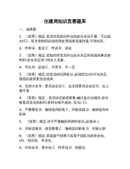 住建局知识竞赛题库一、选择题1、《党章》规定,党员对党组织作出的处分决定不服,可以提出(C),有关党组织必须负责处理或者迅速转递,不得扣压。A、申辩B、复议C、申诉D、诉讼.2、《党章》规定,党组织对党员作出处分决定所依据的事实材料和.处分决定(B)同本人见面。A、可以B、必须C、不用D、不一定3、《党章》规定,对党员的纪律处分,必须经过(A)讨论决定,报党的基层委员会批准。A、支部大会B、委员会会议C、总支部委员会会议D、以上都不是4、《党章》规定,党员经过留党察看,确已改正出错的,应当恢复其党员的权利;坚持出错不改的,应当(C)。A、严重警告B、撤销党内职务C、开除党籍D、撤销党内外职务5...
