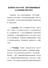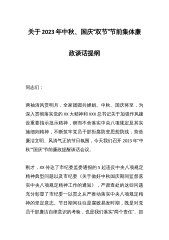 党员领导在2023年中秋、国庆节前集体廉政谈话会上的讲话稿与领导干部任前集体谈话暨廉政谈话会上讲话提纲【两篇文】党员领导在2023年中秋、国庆节前集体廉政谈话会上的讲话稿中秋国庆临近,为进一步强化纪律规矩意识,严防“节日腐败”,营造风清气正的节日氛围,严明中秋国庆期间纪律要求,驰而不息纠“四风”树新风,以严实作风为我市迅速打赢疫情歼灭战提供坚强保障。我提几点要求:一、扛起主体责任。各级“一把手”既要带头严守纪律,又要严负其责、严管所辖,从严从实抓好X各项工作,全力做好居民生活保障,众志成城打赢X战。广大党员干部要模范遵守X各项指令要求,自觉投身基层,引导群众积极配合和支持居X等工作要求,要认真...