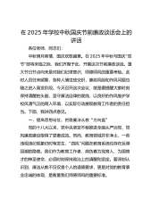 ——中秋国庆话廉洁,担当奋进新征程2025年中秋国庆节前廉政谈话会讲话各位同志:金风送爽,桂香盈袖。在这花好月圆、举国同欢的美好时刻,中秋、国庆双节正迈着轻盈的步伐向我们走来。今天,我在此召开前廉政会,不是一次及的提醒,督促们节谈话这仅时大家守好廉洁底线,更是一场深刻的动员,激励我们将作风建设融入日常、抓在经常,落到实处。特别是在今年落实中央八项规定精神学习教育进入总结阶段、党的二十届三中全会为改“”革发展描绘宏伟蓝图、十五五规划全面开启崭新征程的关键节点,在节日期间强调廉洁自律,其意义格外重大,责任尤为凸显。下面,我提三点要求。一、校准“政治坐标”,在坚守初心时筑牢思想堤坝(一)常学理论,夯...