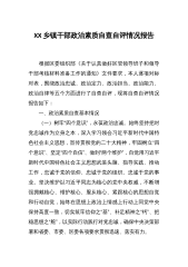 2023年某市人大机关领导干部政治建设考察自评自查报告材料根据市委组织部印发的《XX市科级领导班子和领导干部政治建设考察实施办法(试行)》,结合本人工作、思想、生活方面实际,自我检视、深入剖析。现将有关情况报告如下:一、政治建设工作情况(一)筑牢政治忠诚方面。能够自觉学习贯彻XXXXXXXXXXX主义思想,深刻领悟“两个确立”的决定性意义,切实增强“四个意识”、坚定“四个自信”、做到“两个维护”,在思想上、政治上、行动上同以XXX同志为核心的党中央保持高度一致。能够主动将理论学习成果运用转化到人大工作实际中去,始终将围绕中心、服务大局作为监督工作的出发点、落脚点,做到市委有要求、人大有行动、工...