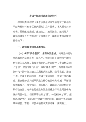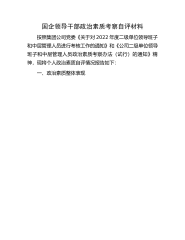 国企领导干部政治素质考察自评材料按照集团公司党委《关于对2022年度二级单位领导班子和中层管理人员进行考核工作的通知》和《公司二级单位领导班子和中层管理人员政治素质考察办法(试行)的通知》精神,现将个人政治素质自评情况报告如下:一、政治素质整体表现1.“坚守政治忠诚,永葆政治本色。一是严格落实第一议”题制度,带领全体党员干部深入学习贯彻党的二十大会议精神,坚持读原著、学原文、悟原理,及时跟进学习习近平总书“记最新重要讲话精神,通过书记领学、组织促学、党员自”“”学的学习模式,进一步领悟两个确立的决定性意义,增“”“”“”强四个意识、坚定四个自信、做到两个维护。全年,组织党总支理论学习中心组学习...