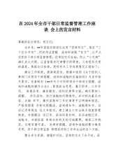 在2024年全市干部日常监督管理工作座谈会上的发言材料尊敬的各位领导,同志们:近年来,**市委组织部深化运用“四种形态”,落实“三个区分开来”,用好用活提醒、函询和诫勉“良方”,从严从实抓好干部日常监督管理,经常性咬耳扯袖,防止“小毛病”演化成大问题,让监督既有纪律警示的硬度,又有组织关爱的温度。根据会议安排,现将有关工作进展情况汇报如下:健全工作制度,提高规范性。根据中组部《关于组织人事部门对领导干部提醒、函询和诫勉的实施细则》及省市相关要求,完善制定《**市关于对科级领导干部进行提醒、函询和诫勉的操作办法》,聚焦政治思想、履行职责、工作作风、道德品质、廉政勤政、组织纪律等方面,确定需纳入提...