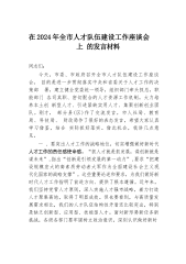 在2024年全市人才队伍建设工作座谈会上的发言材料同志们:今天,市委、市政府召开全市人才队伍建设工作座谈会,目的是进一步贯彻落实中央和省委关于人才工作的决策部署,建立健全党委统一领导,组织部门牵头抓总,职能部门各司其职、密切配合的人才资源工作机制,大力培养本土创新型人才、引进紧缺实用人才、集聚创新创业团队。刚才,部分县(区)作了交流发言,市人社局、教育局、科技局、财政局作了很好的表态发言,希望大家认真学习借鉴,结合实际抓好落实。借此机会,我讲几点意见。一、要突出人才工作的战略地位,切实增强做好新时代人才工作的责任感使命感。“抓人才就是抓发展,谋创新就是谋未来”,指出“创新是引领发展的第一动力”...