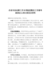 在省市县巡察工作专项检查整改工作督导座谈会上的汇报发言材料尊敬的各位督导组领导,同志们:**省市县巡察工作专项检查整改工作会议召开后,**市迅速行动,市县两级党委和巡察工作领导小组狠抓落实,巡察与纪检监察机关、组织等部门协同发力,不断推动巡察工作高质量发展。根据调研督导要求,现将有关工作进展情况汇报如下:扛起主责抓整改。市委牢牢牵住主体责任这个“牛鼻子”,省委常委、市委书记罗清宇主持召开市委书记专题会议和市委常委会会议,传达学习整改工作会议精神,研究我市贯彻落实意见。以市委文件印发《省委巡视专项检查反馈问题整改方案》,将反馈的问题细化分解成24个整改事项,制定65条整改措施,明确整改目标、完成...