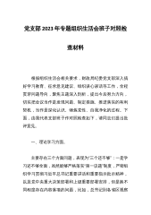 班子2023年主题教育专题民主生活会对照检查材料39篇班子2023年主题教育专题民主生活会对照检查材料范文(1)根据此次民主生活会的安排,xx党委党组班子深入学习习近平新时代中国特色社会主义思想和党的二十大精神,领导班子坚持问题导向,强化问题意识,在认真组织学习研讨、深入开展谈心谈话、广泛征求各方意见的基础上,对照文件明确的理论学习、政治素质、能力本领、担当作为、工作作风、廉洁自律等六个方面和习近平总书记提出的“十二个方面”的具体要求深入查找领导班子存在的问题。现作对照检查报告如下:一、对照检查存在的主要问题xx(单位)班子坚持问题导向,坚持从严从实标准,坚持把班子摆进去、把职责摆进去、把工作...