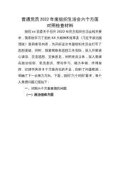 普通党员2022年度组织生活会六个方面对照检查材料按照xx党委关于召开2022年民主组织生活会相关要求,我系统学习了党的XX大精神和党章及《习近平谈治国理政》第四卷等内容,为开好这次专题组织生活会打牢了思想基础。同时,我紧密联系思想工作实际,深入开展谈心谈话、交流思想、交换意见,对照党员义务,深入查摆在政治信仰、党员意识、理论学习、能力本领、作用发挥、纪律作风等6个方面存在的不足,剖析了问题根源,明确了下一步努力方向。下面,按照“六个对照”要求,将个人查摆问题汇报如下:一、对照六个方面查摆的问题(一)政治信仰方面政治信仰是一个事关党的前途命运的根本性问题,也是贯穿于党的建设与党的事业发展全过程...