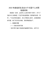 县委机关党支部党员干部2022年度组织生活会对照检查发言提纲 按照《关于召开2022年度基层党组织组织生活会和开展民主评议党员的通知》要求,本人紧扣主题,认真学习XXX精神、党章和习近平总书记重要讲话、重要指示批示精神,与支部委员、党员及群众代表开展了谈心谈话,诚恳征求意见建议,围绕深刻领悟“两个确立”的决定性意义、坚决做到“两个维护”,学懂弄通做实习近平新时代中国特色社会主义思想等方面,对照习近平总书记的号召和要求,对照党员义务,深入查找在政治信仰、党员意识、理论学习、能力本领、作用发挥、纪律作风等方面的问题和不足,深刻剖析思想根源,明确整改措施,现将对照检查有关情况汇报如下。 一、存在问...