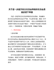 关于进一步提升民主生活会和组织生活会质效的若干举措为进一步提升民主生活会和组织生活会质效,有效解决民主生活会和组织生活会不严肃、不认真等问题,根据《关于新形势下党内政治生活的若干准则》《县以上党和国家机关党员领导干部民主生活会若干规定》《中国共产党支部工作条例(试行)》等精神及省、市委有关部署,明确如下措施。一、民主生活会1.参会对象民主生活会参会对象为各单位领导班子中党员领导干部。民主生活会到会人数必须达到应到会人数的三分之二以上。班子成员中党员领导干部不足3人的,经请示上级党组织同意,参会范围可扩大到内设机构和下属单位党员主要负责人。扩大参会人员可对领导班子成员提出批评,不作自我批评。扩大...
