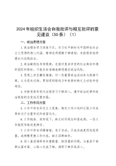 2024年组织生活会自我批评与相互批评的意见建议(50条)(1)一、政治思想方面1.政治理论学习深度不足,对习近平新时代中国特色社会主义思想的核心内涵、精神实质理解不够透彻,未能很好地将理论与实践结合。2.政治敏锐性有待提高,在面对复杂多变的社会舆论环境和国际形势时,不能及时准确地辨别潜在政治风险。3.思想上存在懈怠情绪,对一些重要政治活动参与热情不高,认为是走过场,贯彻党的路线方针政策时缺乏主动性和创造性。4.对新党章和党内法规学习不够深入,遵守政治纪律和政治规矩的自觉性还需加强。二、工作作风方面5.工作中存在形式主义现象,制定工作计划和汇报工作成果时过于注重形式和表面功夫。6.工作拖沓、效...