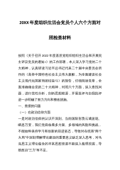 2023年主题教育专题组织生活会个人“六个方面”对照检查材料 按照中共XXXX纪委机关、中共XXXX委组织部、XX委主题教育办《关于认真开好第一批主题教育2023年度专题生活会的通知》要求,会前我进行了认真的自学和专题集中学,结合思想和工作实际,紧扣“学思想、强党性、重实践、建新功”总要求,围绕“六个方面”开展批评和自我批评,开展谈心谈话以及开展意见征集到XX条,归纳XX条,深挖问题根源,认真制定整改措,现对照检查如下: 一、上一年度组织生活会存在问题的整改情况 针对上年度组织生活会自己查摆的XX个方面XX个问题和同志们批评提出的问题,我先后制定了XX条整改措施,坚持对标对表、举一反三,...